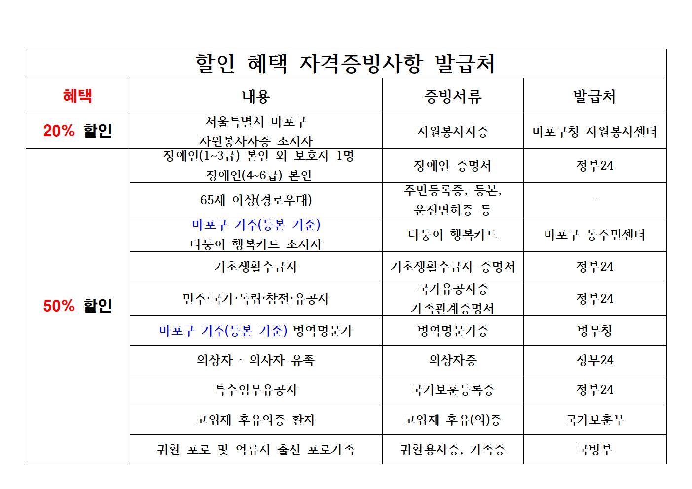 | 50% 할인 | 장애인(1~3급 보호자 1명), 장애인(4~6급 본인), 65세 이상, 다둥이 행복카드 소지자, 기초생활수급자, 민주·국가·독립·참전 유공자, 병역명문가, 의상자·의사자유족, 특수임무유공자, 고엽제 후유의증 환자, 귀환포로 및 억류지출신 포로가족 |