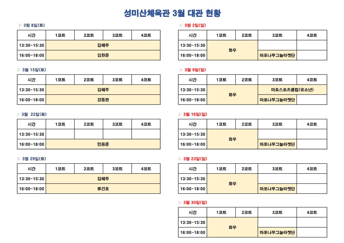 [망원나들목체육관] 2025년 3월 대관 접수 현황(2025. 03. 11.(화) 기준)