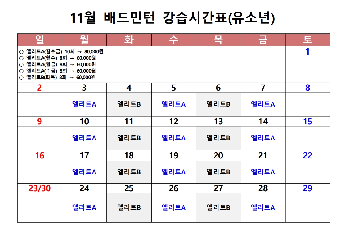 유소년 배드민턴 11월 강습시간표