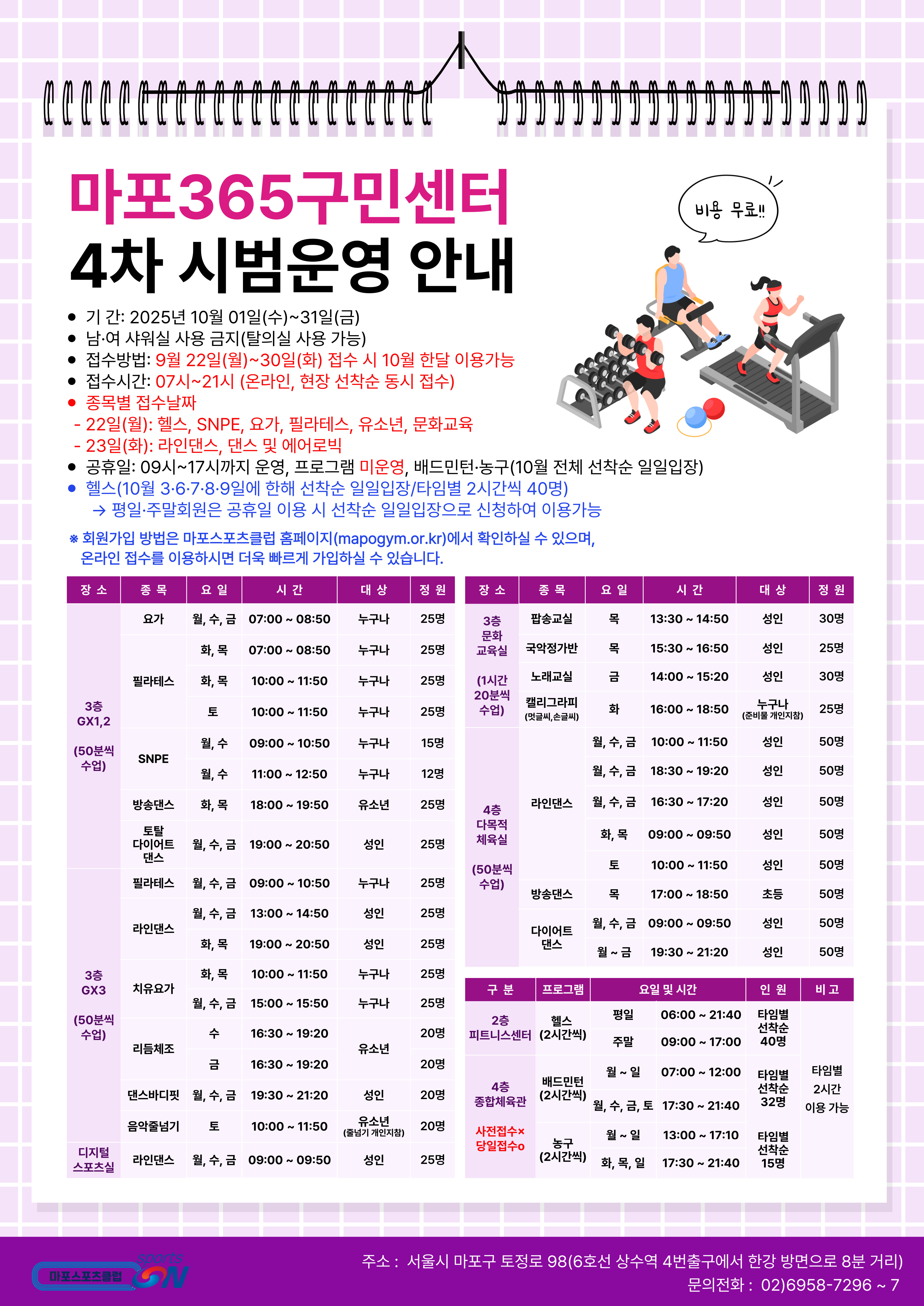 - 헬스 → 10월 3 · 6 · 7 · 8 · 9일에 한해 선착순 일일입장(타임별 2시간씩 40명)