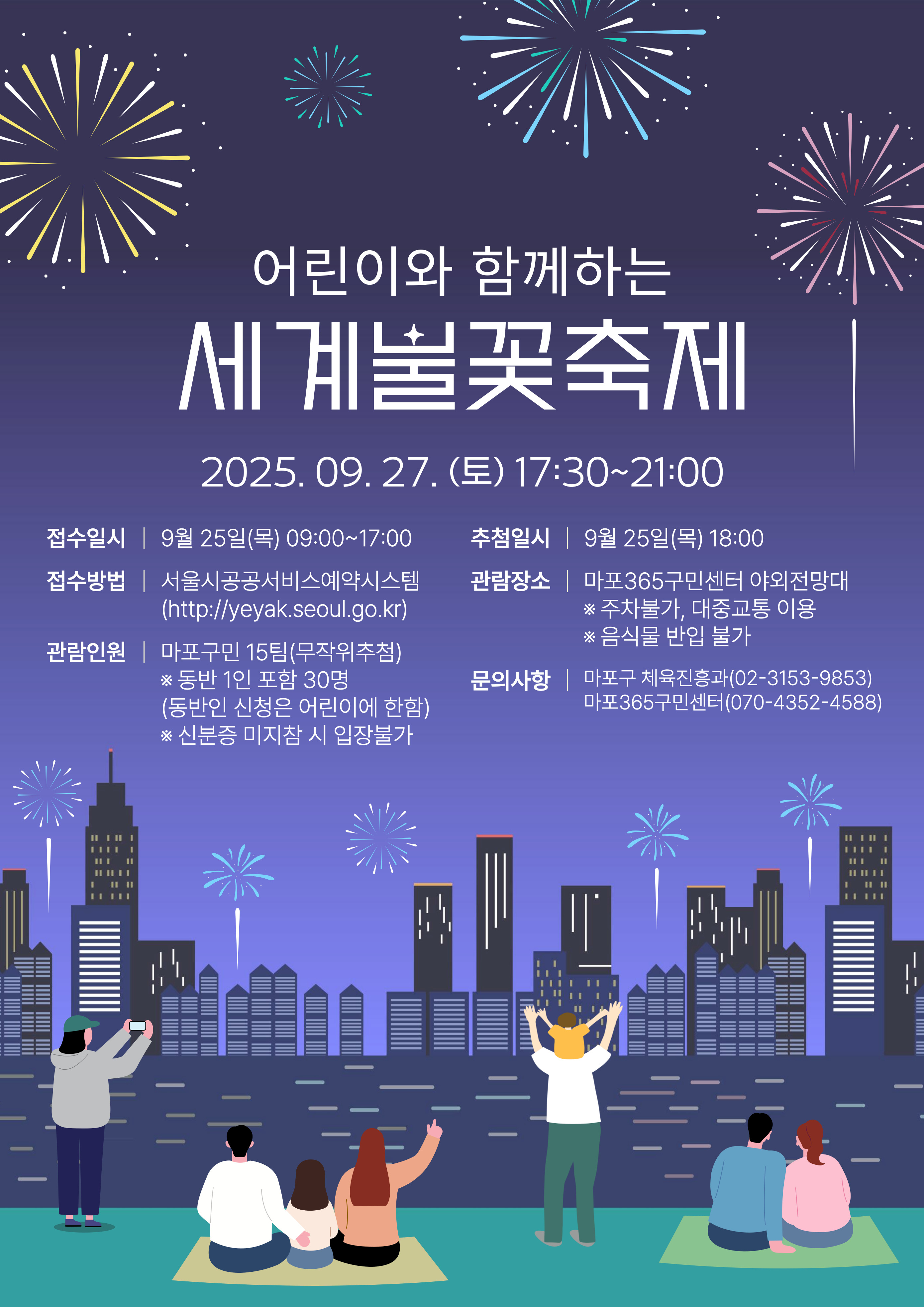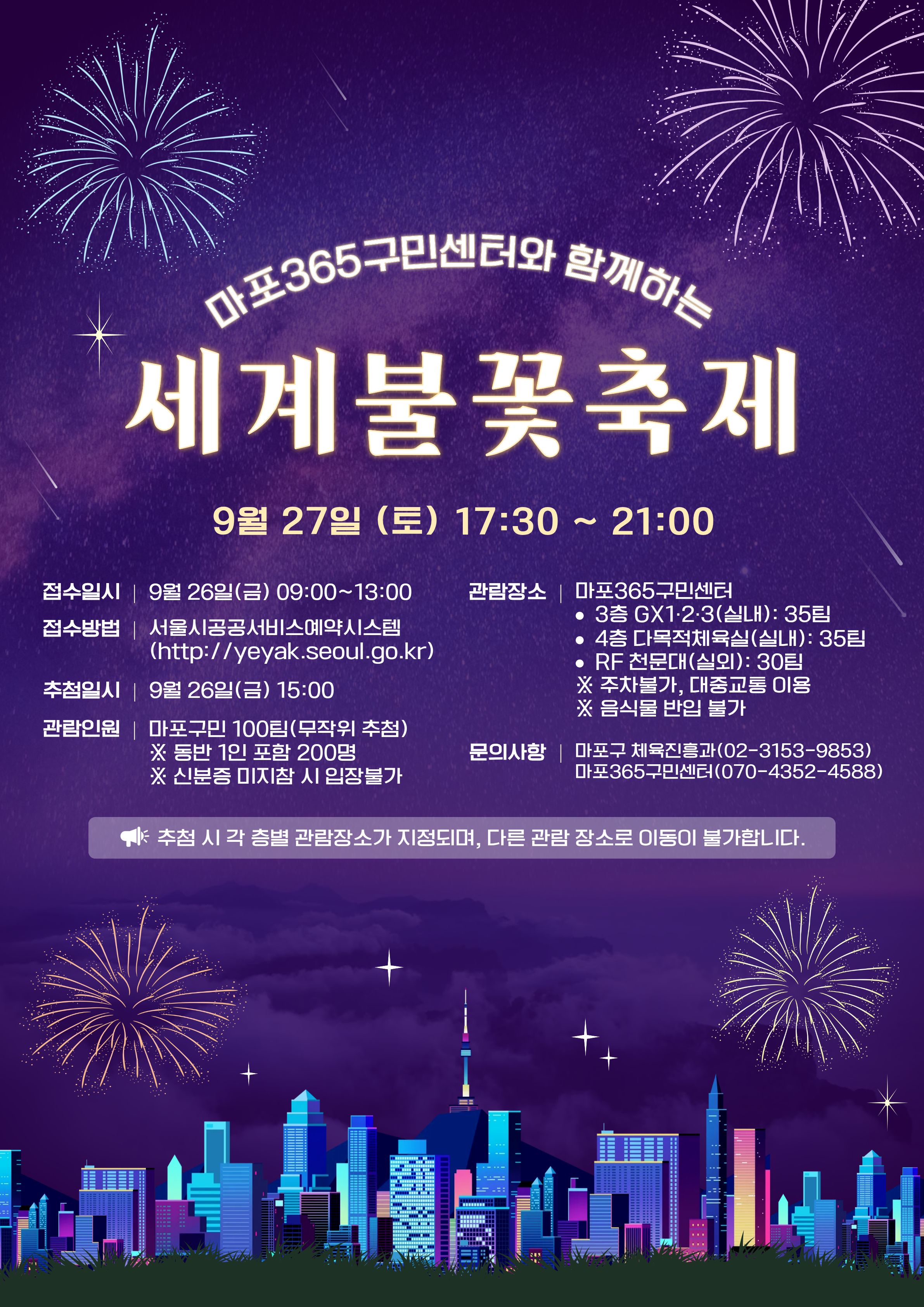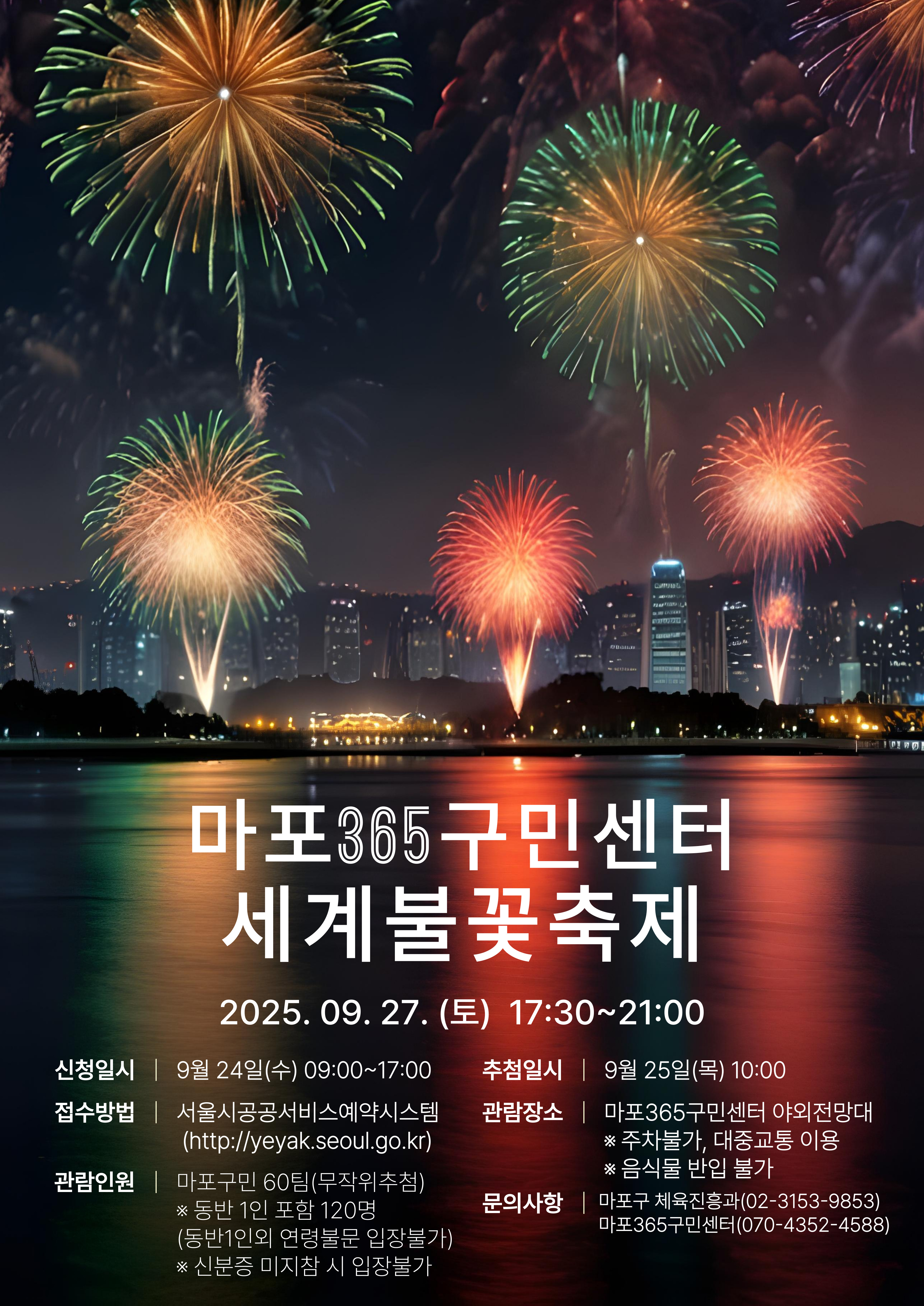 서울시공공서비스예약시스템 로그인 → 문화체험 → (선택)마포구 → (선택)문화행사 → (선택)@@세계불꽃축제 관람 행사 → 예약하기 → (달력)9월 27일 → 예약하기