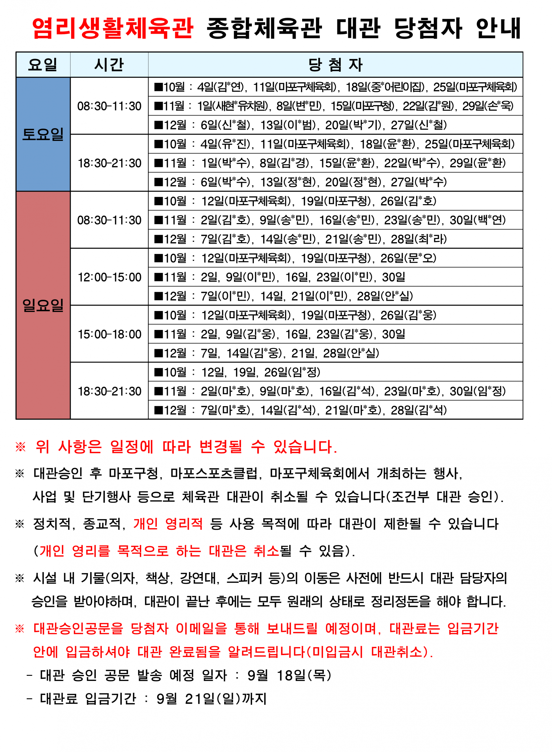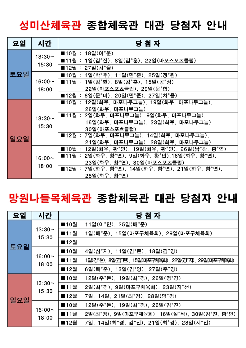 [성미산,염리,망원나들목체육관] 2025년 4분기(10~12월) 종합체육관 대관 당첨자 안내