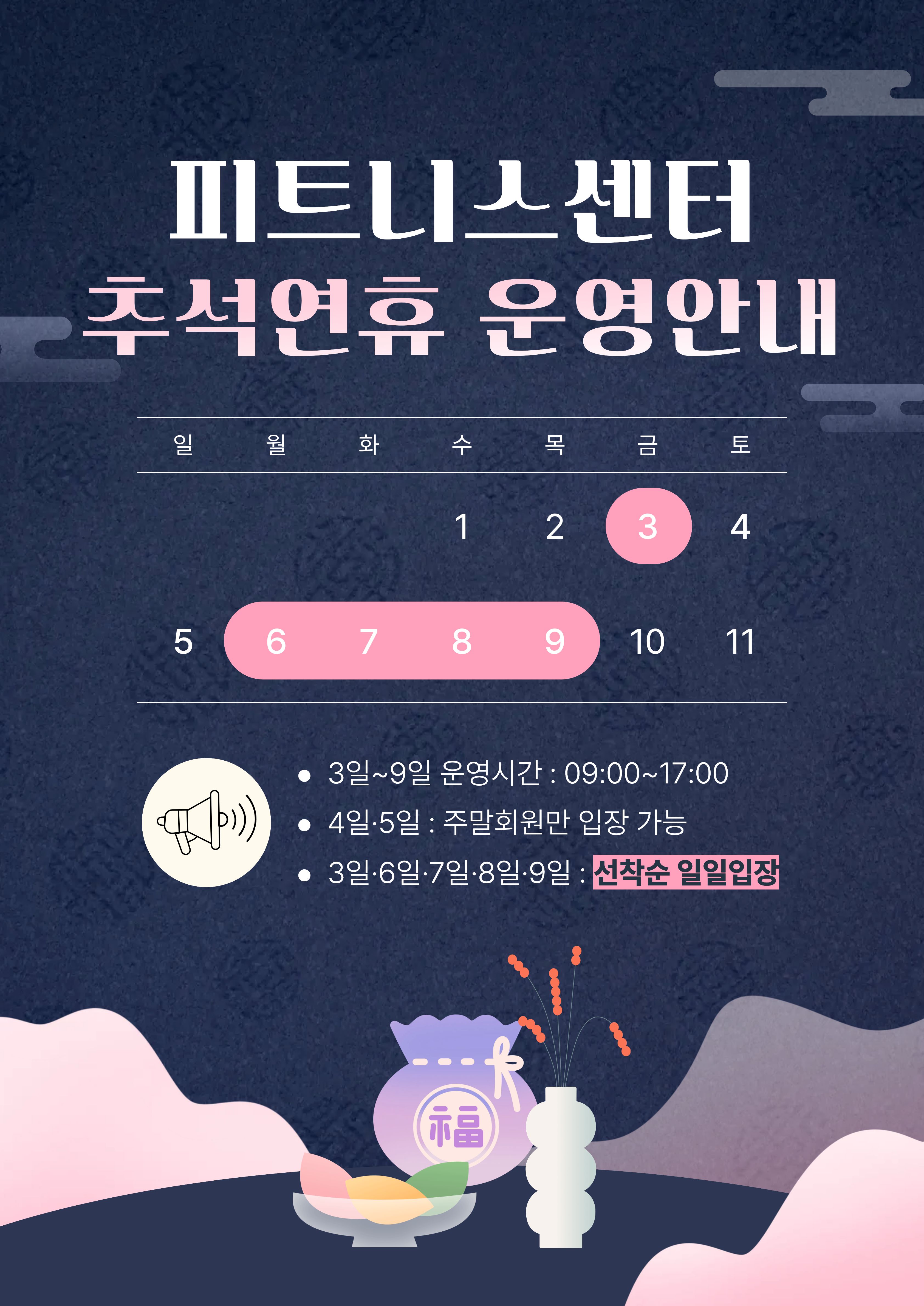 ※ 피트니스센터 추석연휴 타임별 정원(타임별 선착순 일일입장)