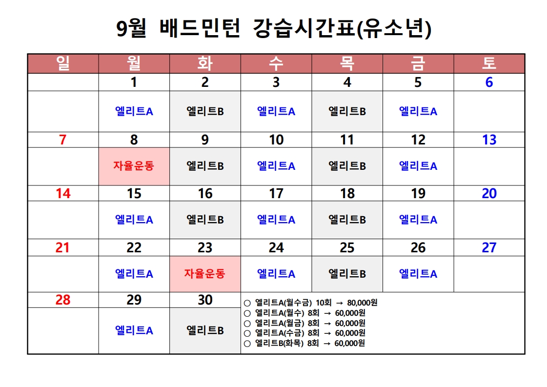유소년 배드민턴 9월 강습시간표