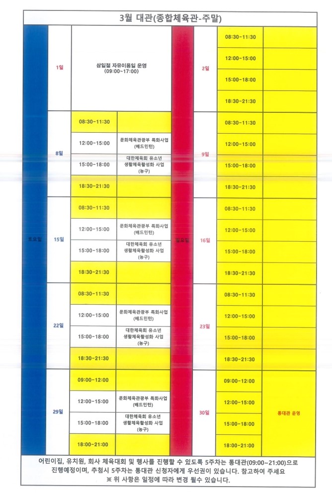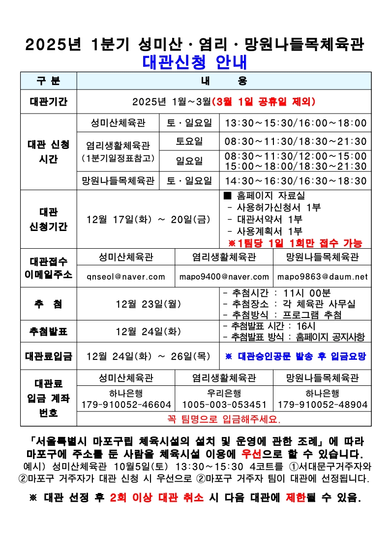 [성미산,염리,망원나들목체육관] 2025년 1분기(1~3월) 종합체육관 대관 신청 및 운영 안내