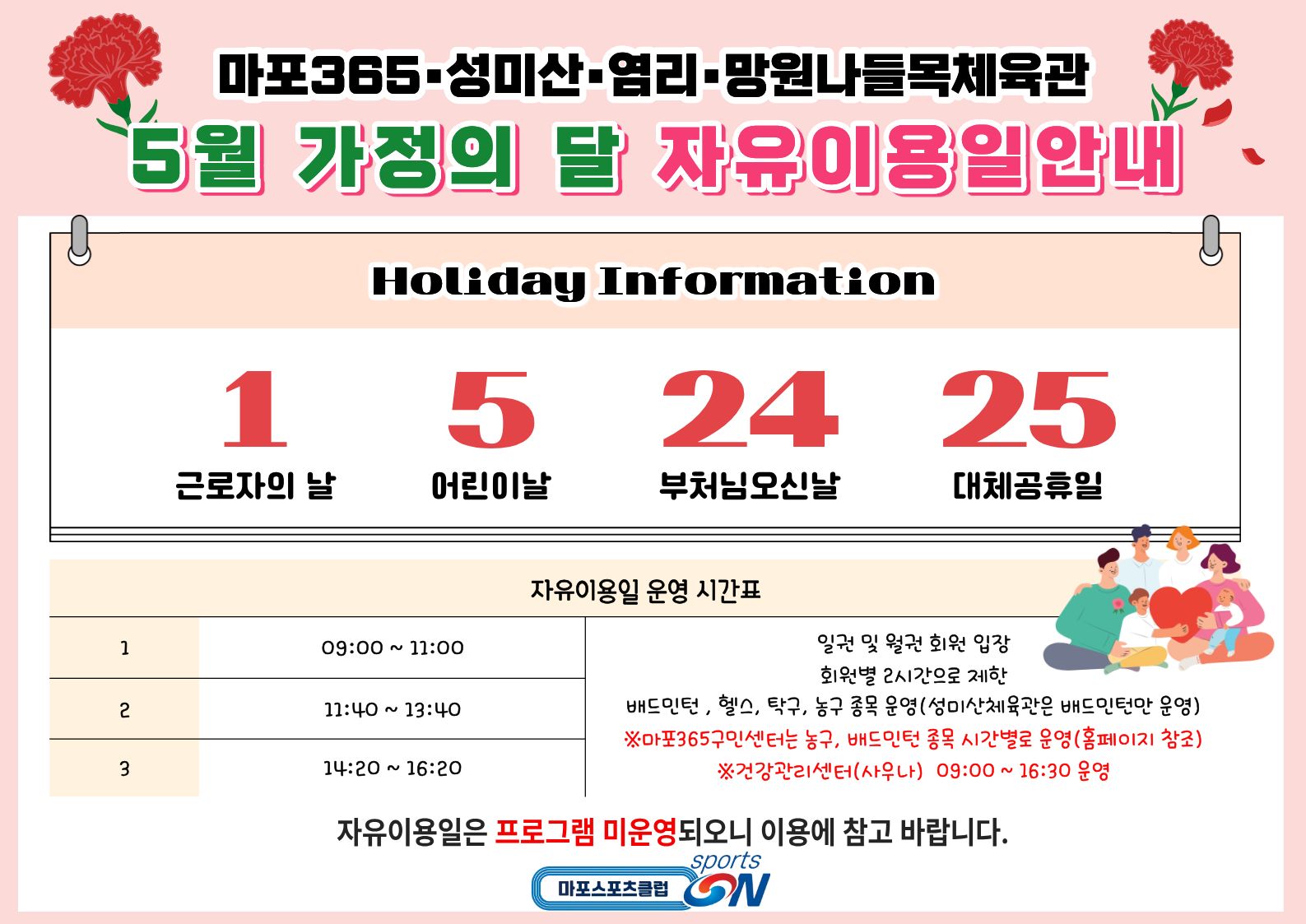 마포365 · 성미산 · 염리 · 망원나들목체육관 5월 가정의 달 자유이용일 안내