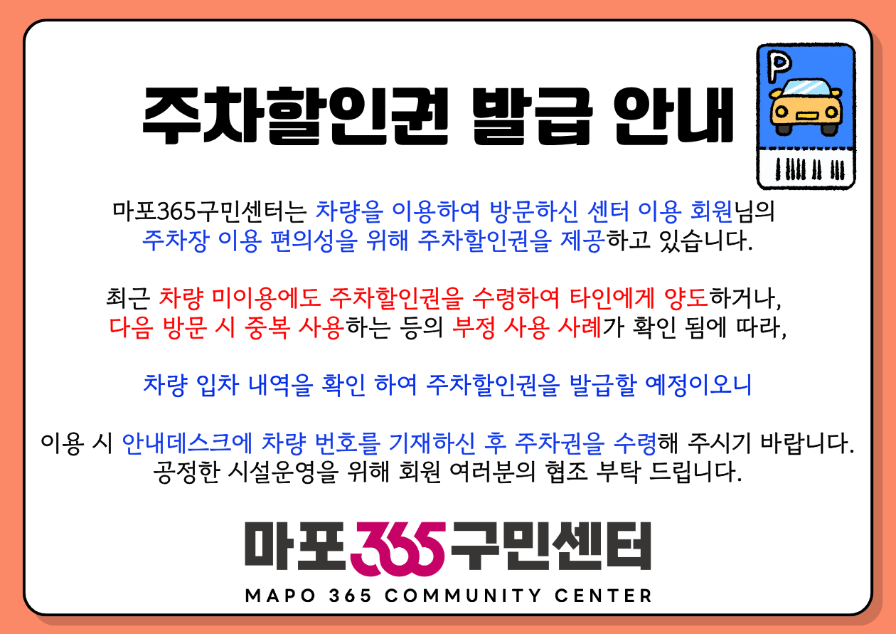 마포365구민센터 주차할인권 발급 안내(부정사용방지)