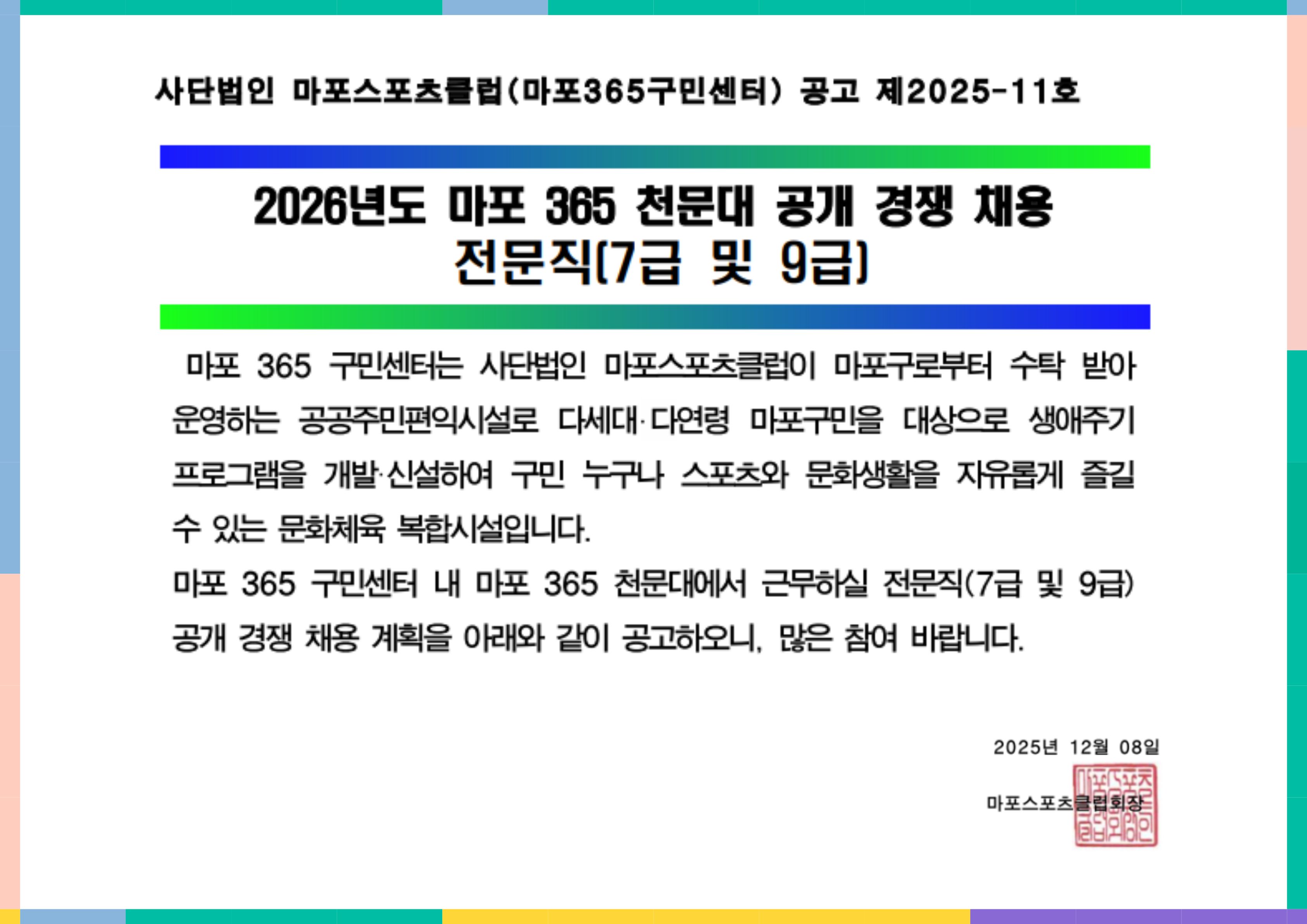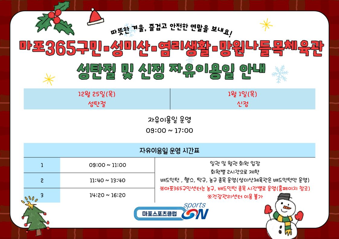 마포365구민센터·성미산·염리생활·망원나들목체육관 성탄절 및 신정 자유이용일 안내