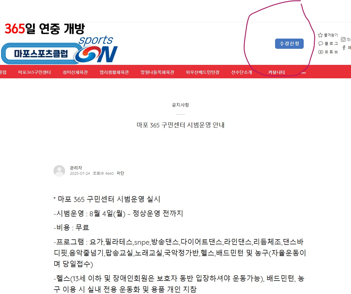 -프로그램 : 요가,필라테스,snpe,방송댄스,다이어트댄스,라인댄스,리듬체조,댄스바디핏,음악줄넘기,팝송교실,노래교실,국악정가반,헬스,배드민턴 및 농구(자율운동이며 당일접수)